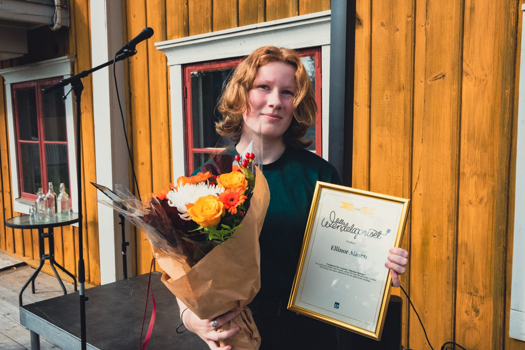 Ellinor Alåsen, tredjepristagare av Lilla Wendelapriset för novellen ”Mördad flamma”. Juryns motivering: ”En novell som börjar med tragedi, vänds till hopp för att sen sluta i ondska. Ett bidrag med stark undertext och ett spännande upplägg.”
