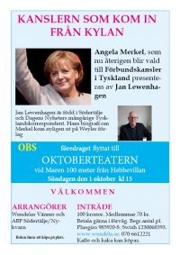 Vårt program i går blev en stor framgång tack vare Jan Lewenhagen själv förstås och föremålet för hans tal Angela Merkel. Och naturligtvis för att vi fick disponera Oktoberteaterns fina lokaler. Tack Ninne och Annika