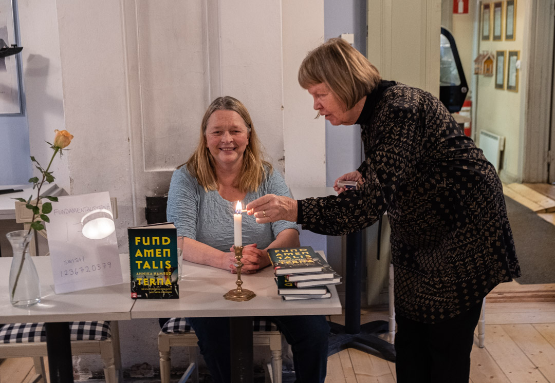 Ami Lönnroth tänder ett ljus och inleder programvåren i Wendelas Hus