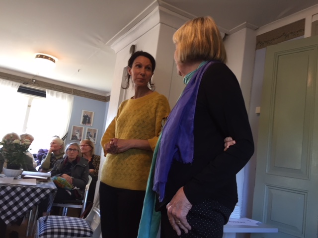Fatima Bremmer, författare till Ett jävla solsken om Ester Blenda Nordström, i samspråk med Wendelas Vänners ordförande, Ami Lönnroth. Många journalister i publiken, bland dem på denna bild Lillemor Melsted, under många år framstående politisk reporter på TT och tidigare gift med nyligen avlidne Per Ahlmark, Anita Widén, under ett antal år redaktör för Fredrika Bremerförbundets tidskrift Hertha och Monika Brannäs som för oss i Wendelas Vänner har den stora meriten av att ha bott i Wendela Hebbes lägenhet på Stora Nygatan 21 i Gamla stan i Stockholm.