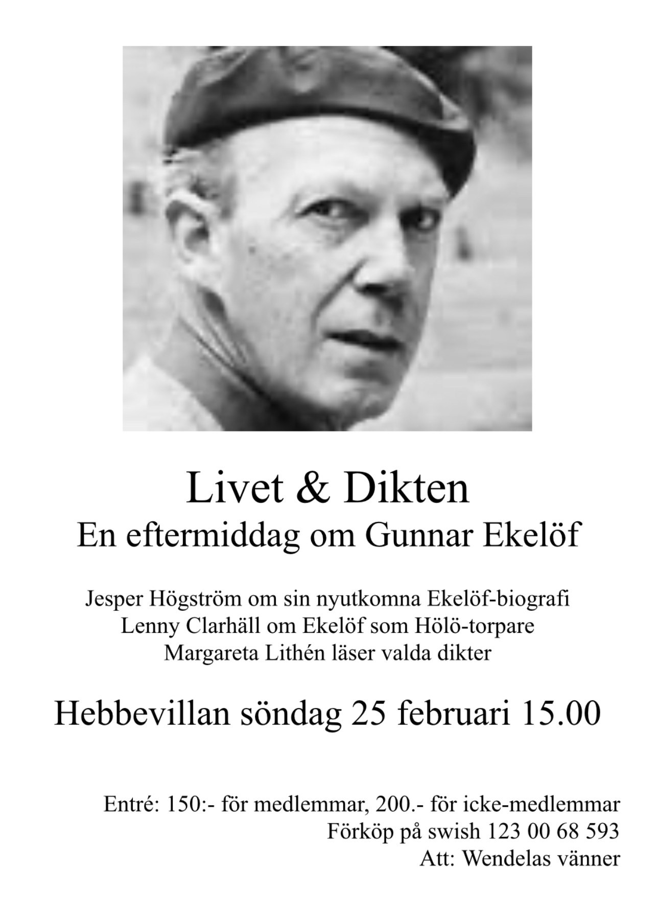 Söndagen den 25 februari bjuder vi in till en eftermiddag på temat Gunnar Ekelöf med följande programpunkter: