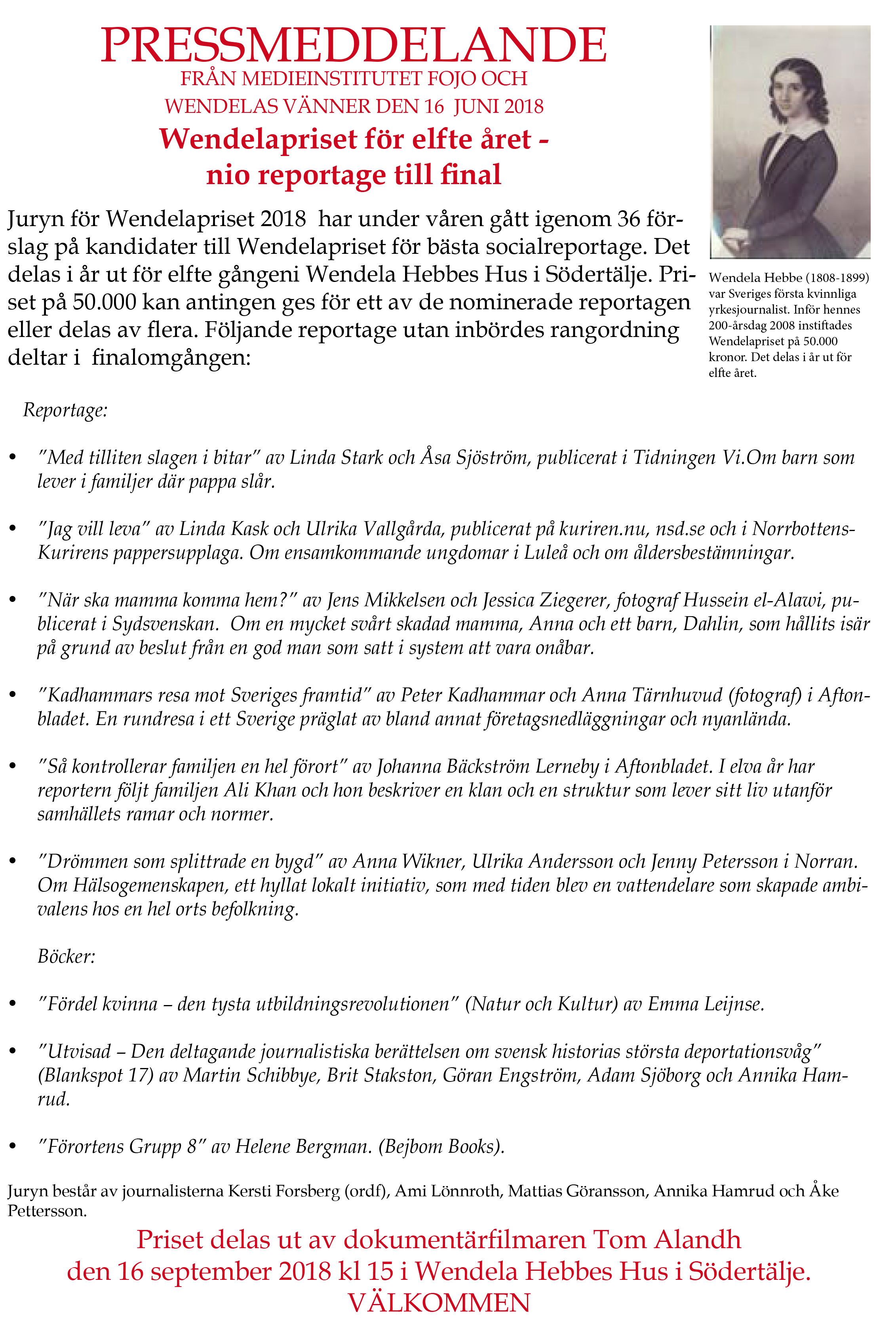 Pressmeddelande Wendelaprisets finalister Pressmedd Wendelapriset finalister 2018 Per Eric Mattsson2018-06-15T23:47:14+02:0015 juni 2018| Dela detta inlägg på sociala medier! FacebookWhatsAppE-post
