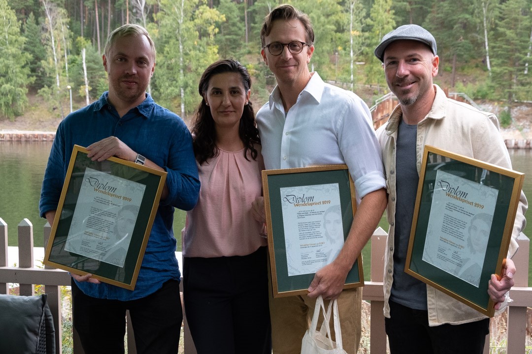 Pristagarna 2019 Måns Mosesson, Erik Wiman och Magnus Wennman samt Negra Efendic, prisutdelare och pristagare 2015.